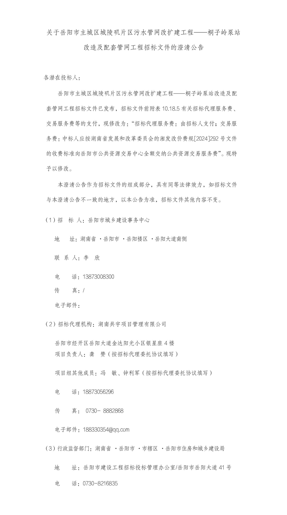 关于岳阳市主城区城陵矶片区污水管网改扩建工程——桐子岭泵站改造及配套管网工程招标文件的澄清公告