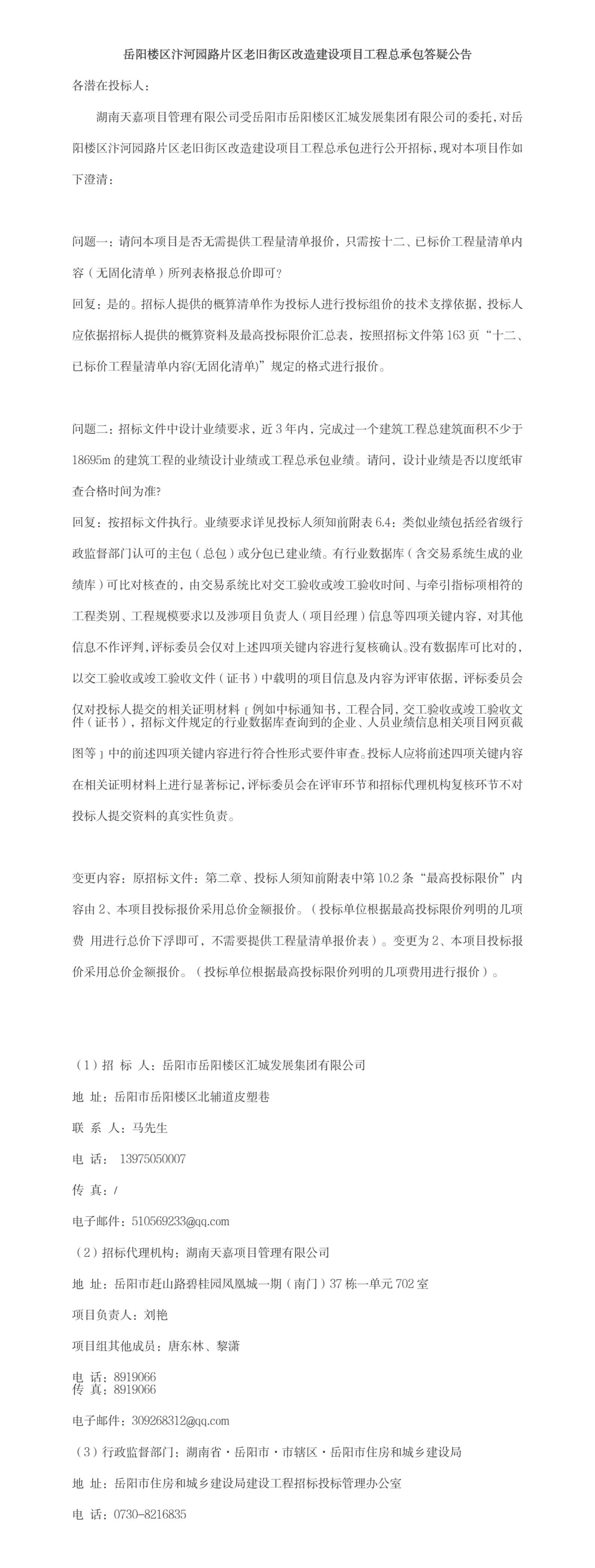 岳阳楼区汴河园路片区老旧街区改造建设项目工程总承包答疑公告