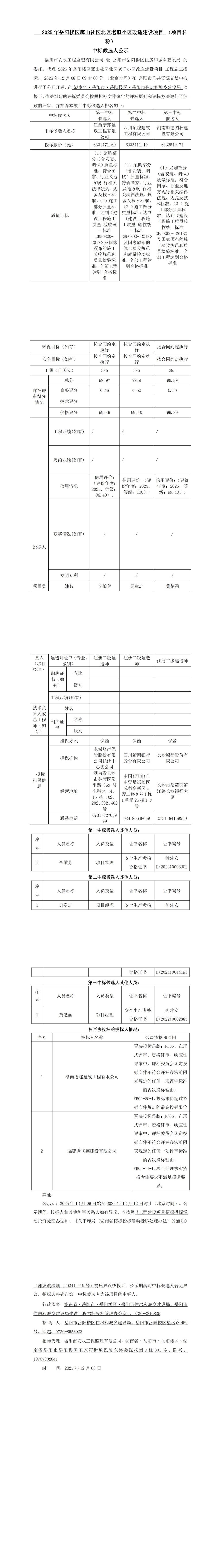 2025 年岳阳楼区鹰山社区北区老旧小区改造建设项目(项目名称) 中标候选人公示
