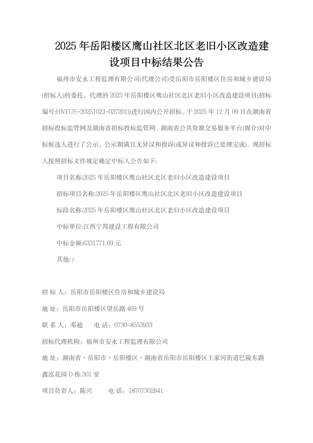 2025年岳阳楼区鹰山社区北区老旧小区改造建设项目中标结果公告