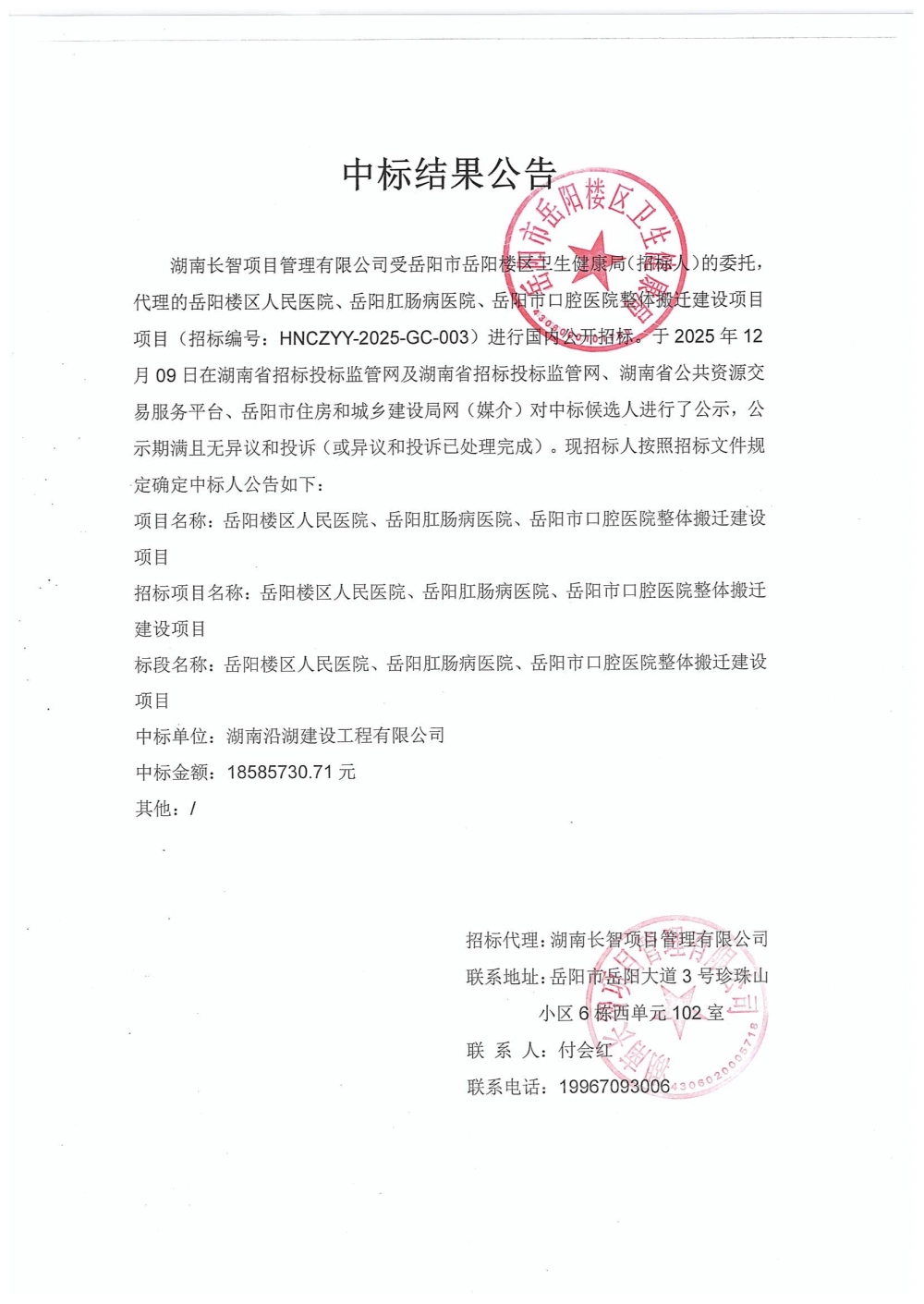 岳阳楼区人民医院、岳阳肛肠病医院、岳阳市口腔医院整体搬迁建设项目中标结果公告