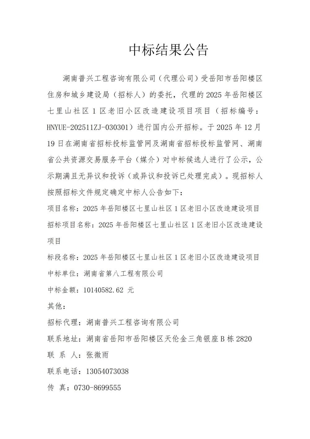2025年岳阳楼区七里山社区1区老旧小区改造建设项目中标结果公示