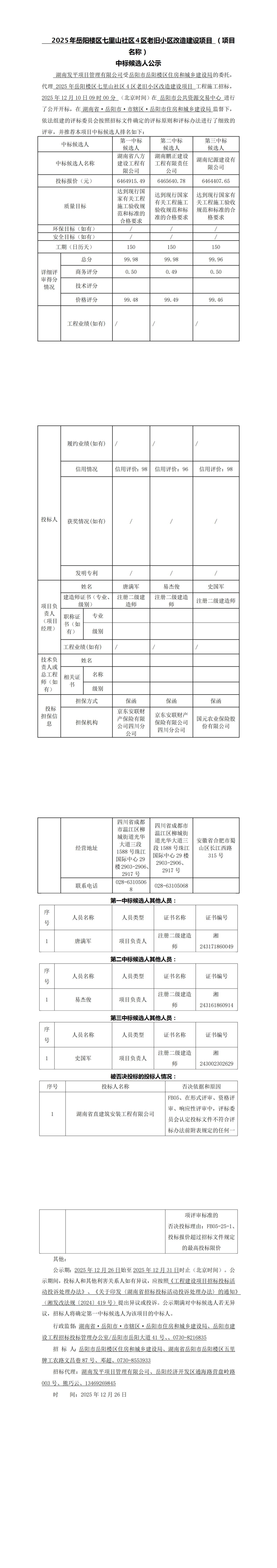 2025年岳阳楼区七里山社区4区老旧小区改造建设项目中标候选人公示