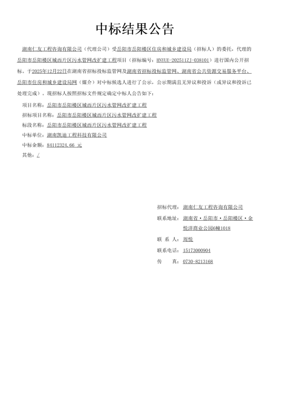 岳阳市岳阳楼区城西片区污水管网改扩建工程中标结果公告