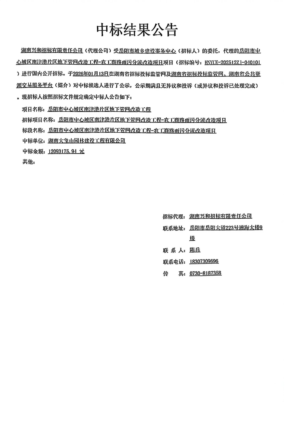 岳阳市中心城区南津港片区地下管网改造工程-农工商路雨污分流改造项目中标结果公示