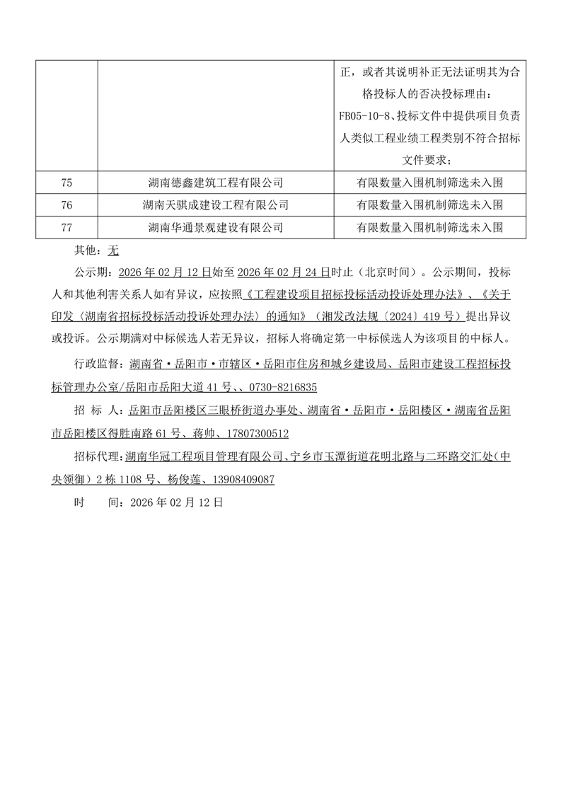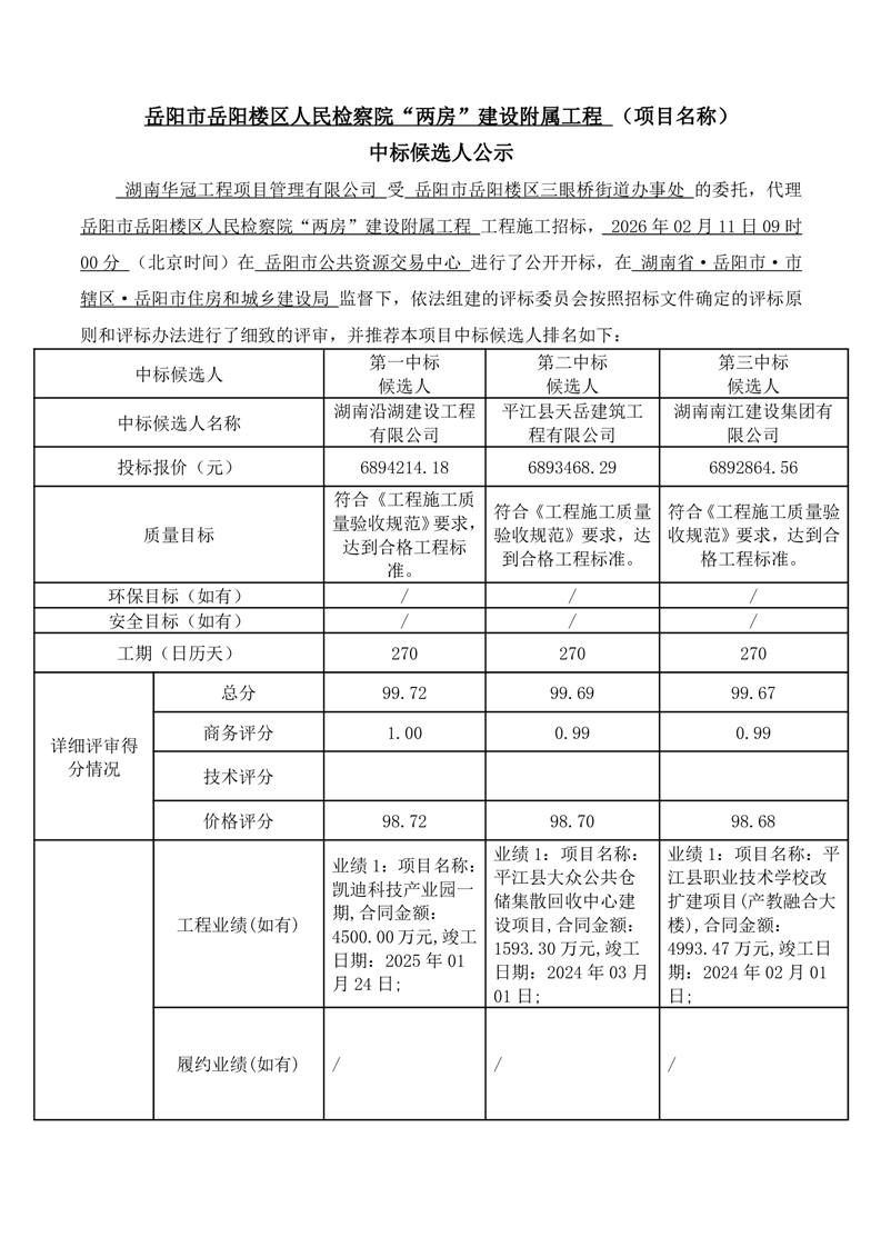 岳阳市岳阳楼区人民检察院“两房”建设附属工程 (项目名称)中标候选人公示