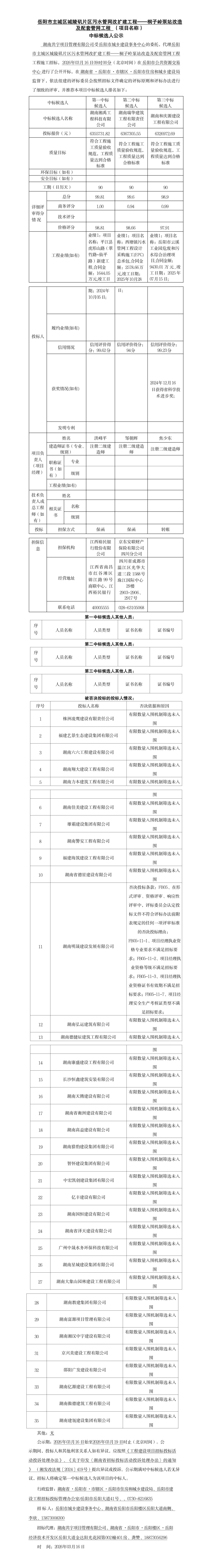 岳阳市主城区城陵矶片区污水管网改扩建工程——桐子岭泵站改造及配套管网工程 (项目名称) 中标候选人公示
