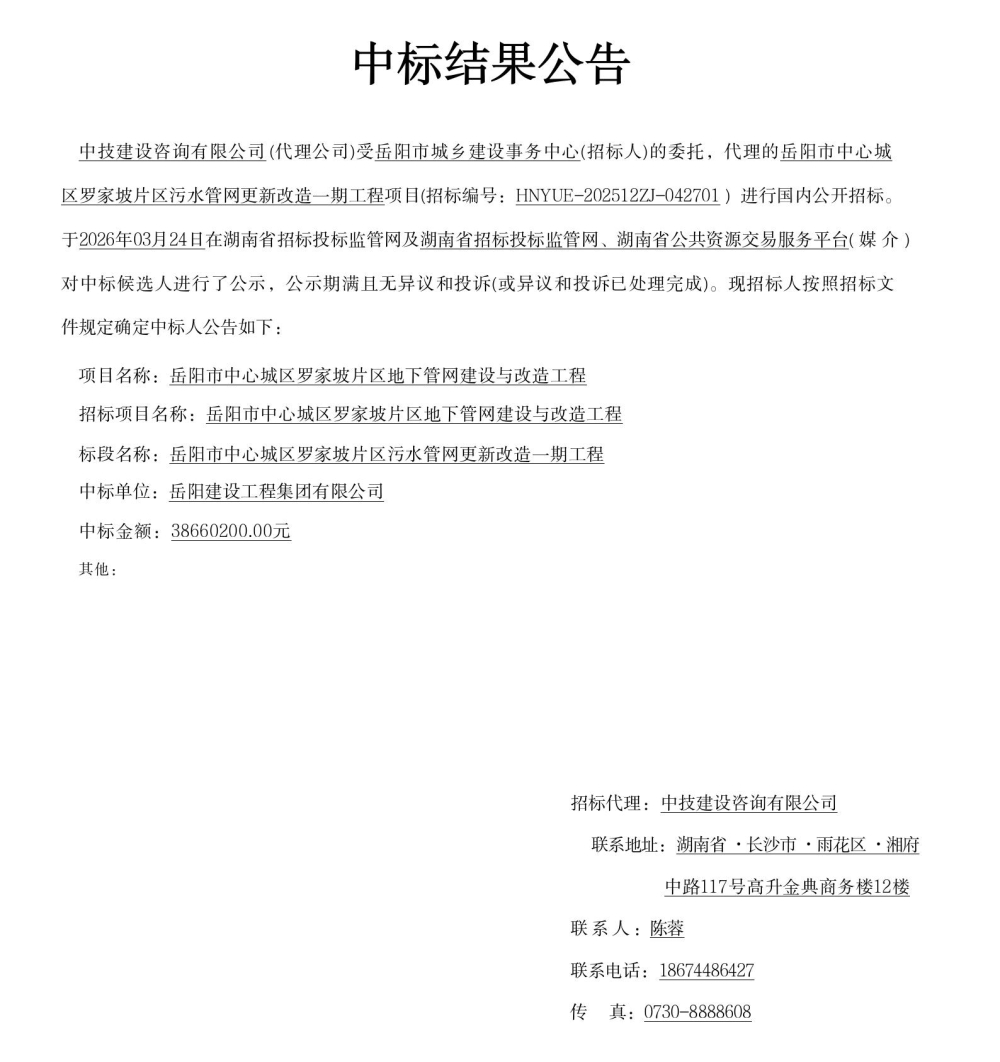 岳阳市中心城 区罗家坡片区污水管网更新改造一期工程项目 中标结果公告