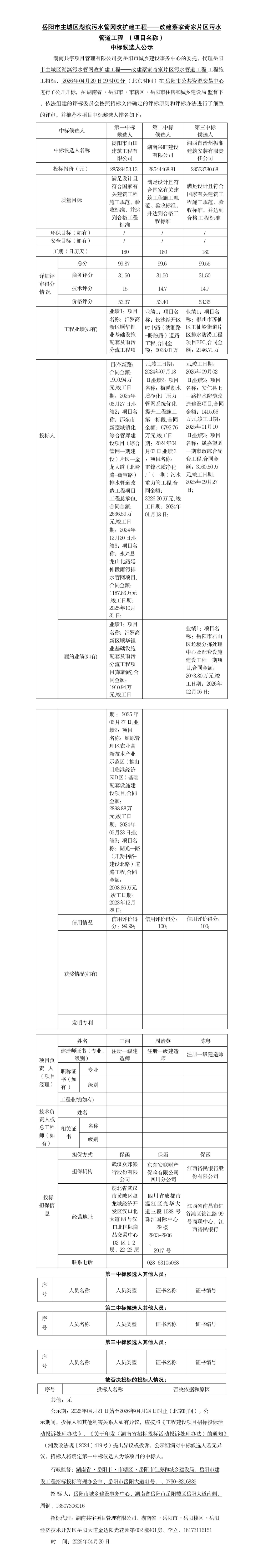 岳阳市主城区湖滨污水管网改扩建工程——改建蔡家奇家片区污水 管道工程 (项目名称) 中标候选人公示