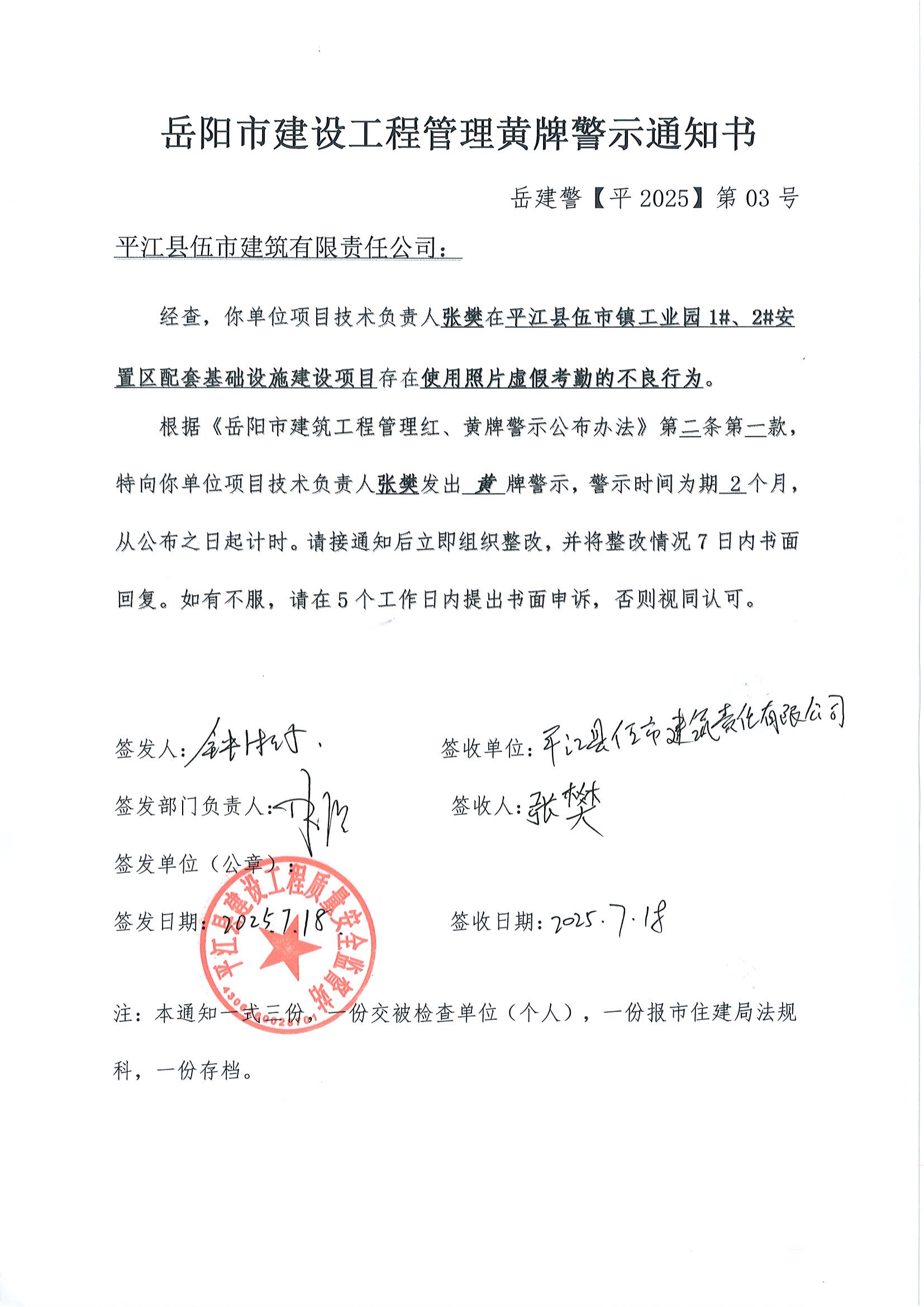 平江县伍市建筑有限责任公司项目技术负责人张樊
