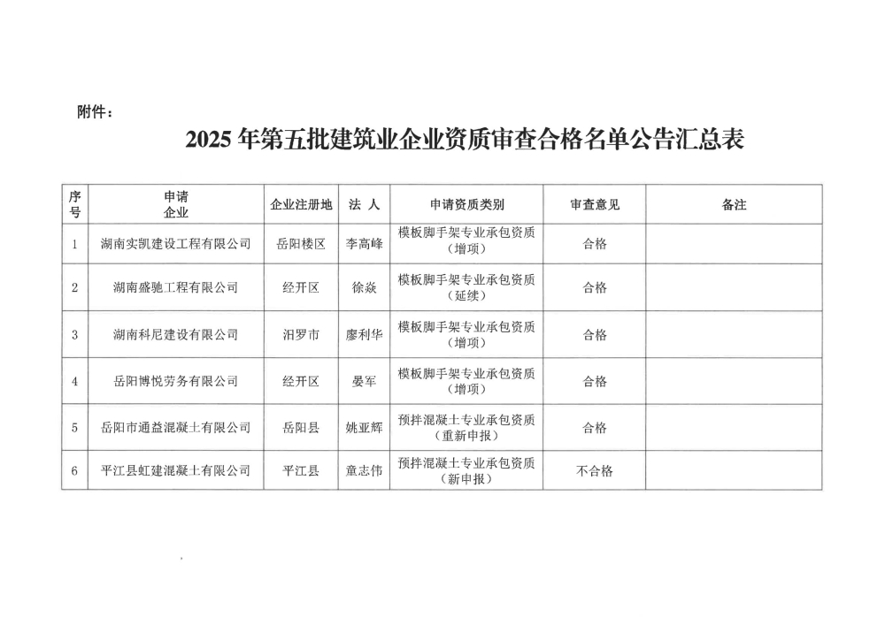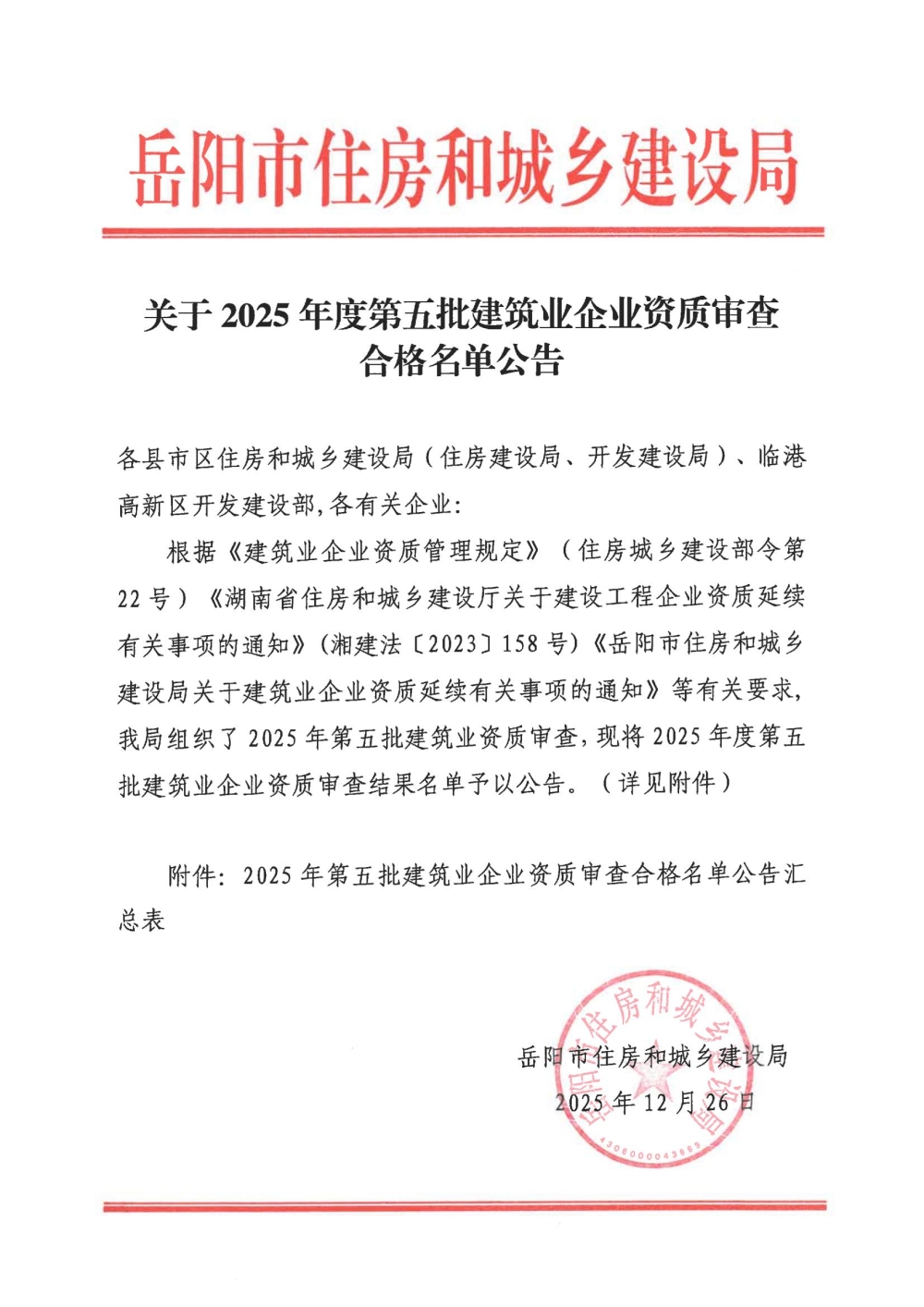 关于2025年度第五批建筑业企业资质审查合格名单公告