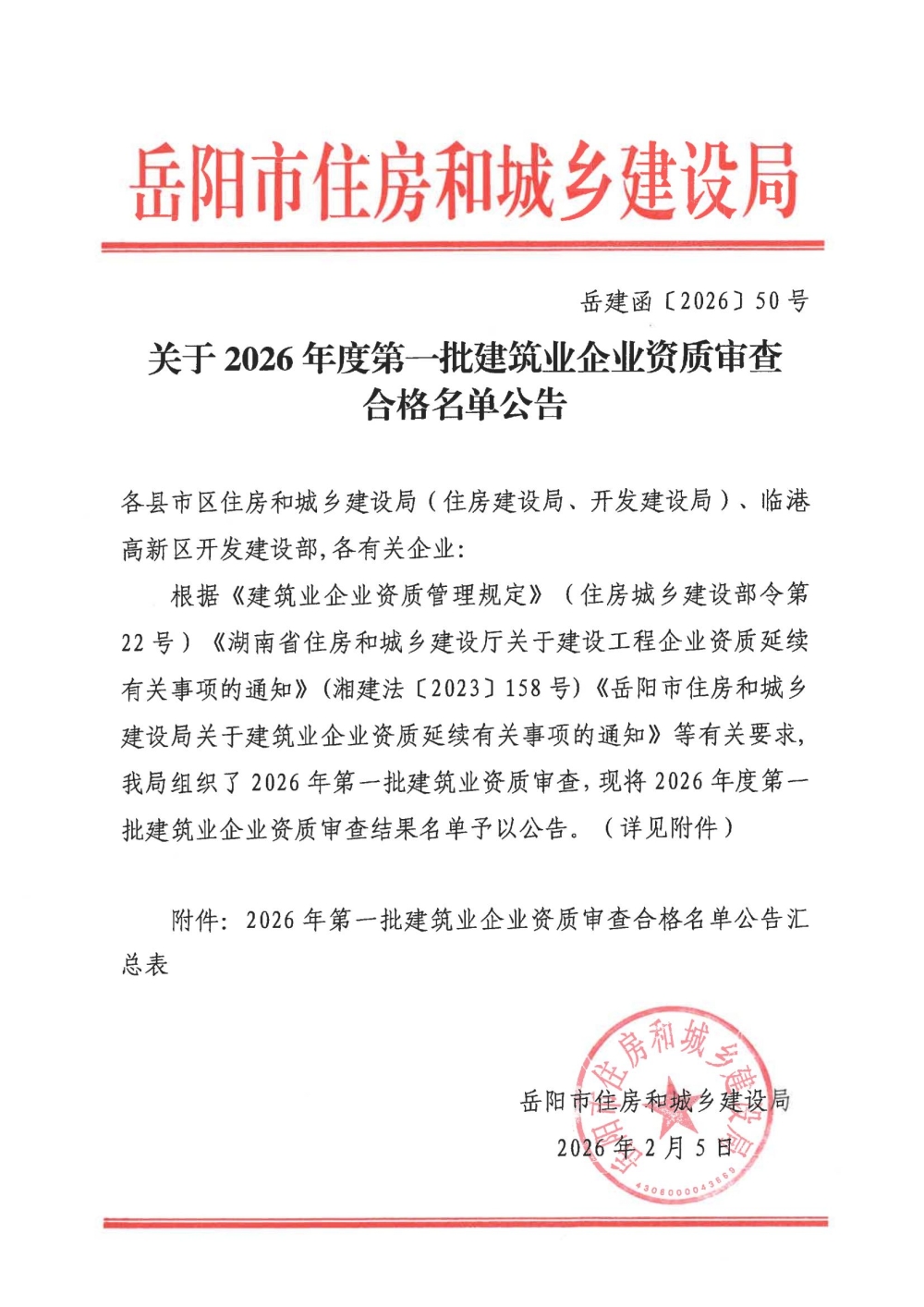关于2026年度第一批建筑业企业资质审查合格名单公告
