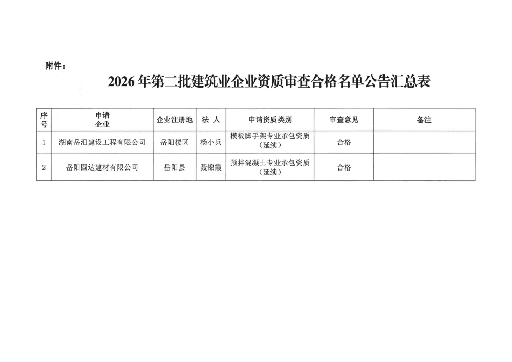 关于2026年度第二批建筑业企业资质审查合格名单公告