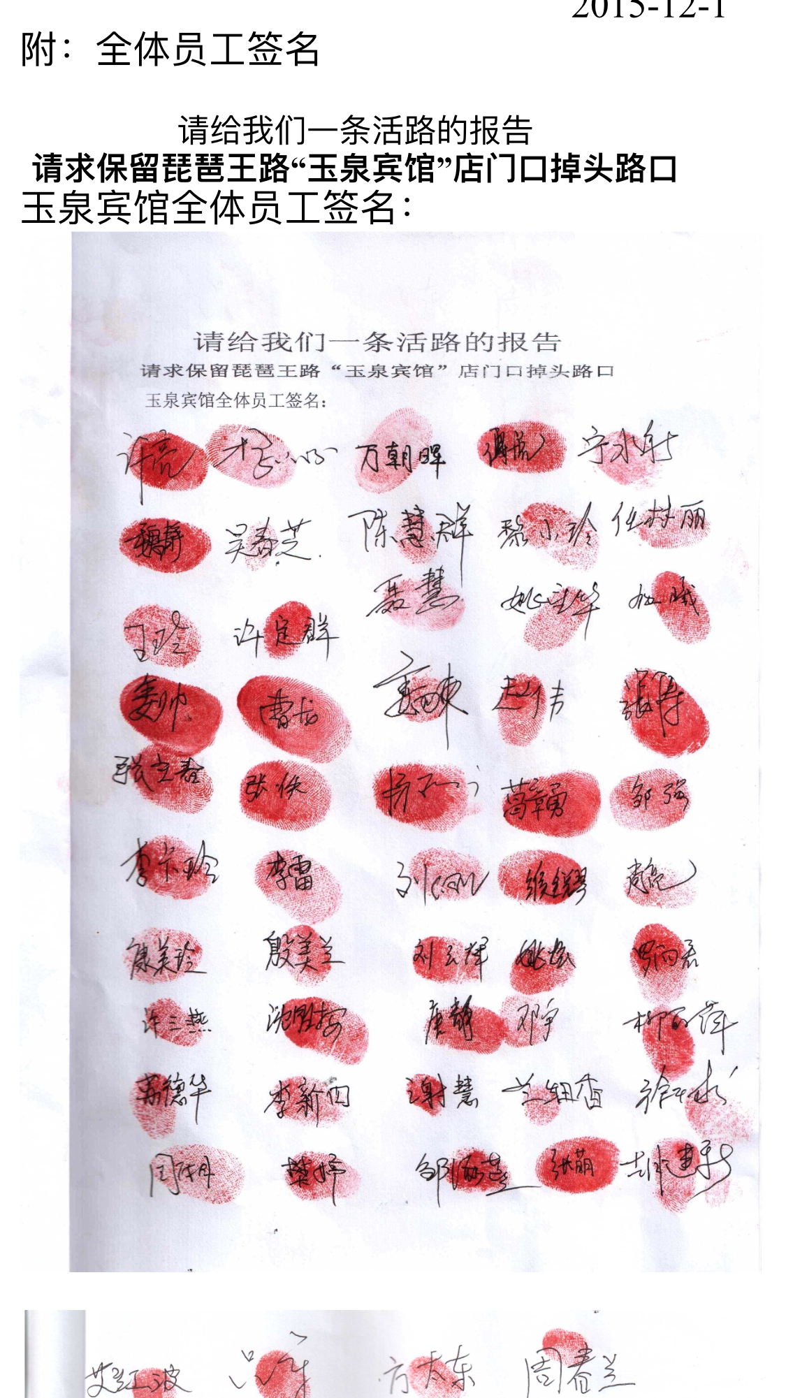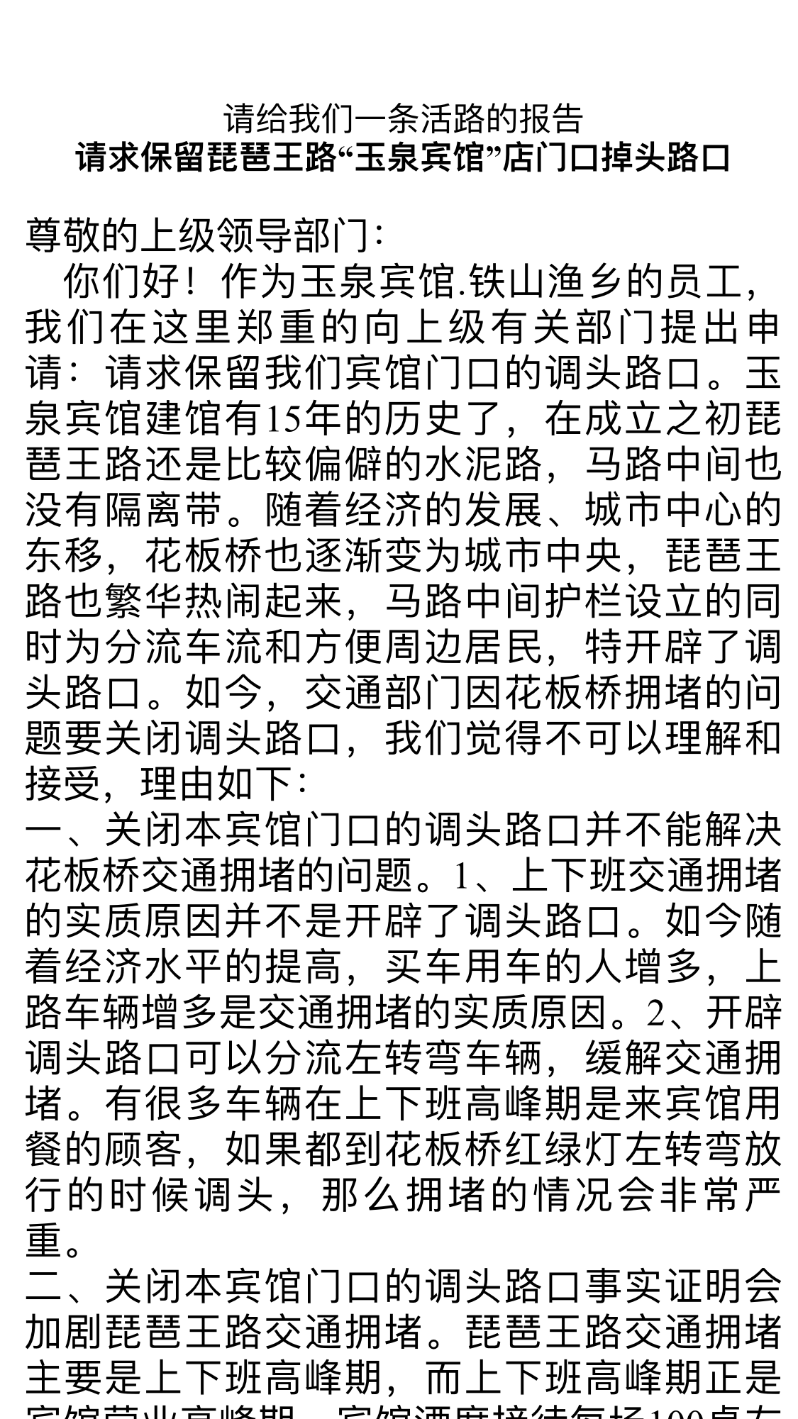 请给我们一条活路的报告 请求保留琵琶王路“玉泉宾馆”店门口掉头路口 尊敬的上级领导部门: 你们好!作为玉泉宾馆.铁山渔乡的员工,我们在这里郑重的向上级有关部门提出申请:请求保留我们宾馆门口的调头路口。玉泉宾馆建馆有15年的历史了,在成立之初琵琶王路还是比较偏僻的水泥路,马路中间也没有隔离带。随着经济的发展、城市中心的东移,花板桥也逐渐变为城市中央,琵琶王路也繁华热闹起来,马路中间护栏设立的同时为分流车流和方便周边居民,特开辟了调头路口。如今,交通部门因花板桥拥堵的问题要关闭调头路口,我们觉得不可以理解和接受,理由如下: 一、关闭本宾馆门口的调头路口并不能解决花板桥交通拥堵的问题。1、上下班交通拥堵的实质原因并不是开辟了调头路口。如今随着经济水平的提高,买车用车的人增多,上路车辆增多是交通拥堵的实质原因。2、开辟调头路口可以分流左转弯车辆,缓解交通拥堵。有很多车辆在上下班高峰期是来宾馆用餐的顾客,如果都到花板桥红绿灯左转弯放行的时候调头,那么拥堵的情况会非常严重。 二、关闭本宾馆门口的调头路口事实证明会加剧琵琶王路交通拥堵。琵琶王路交通拥堵主要是上下班高峰期,而上下班高峰期正是宾馆营业高峰期。宾馆酒席接待每场100桌左右,如果每桌有一位客人开车过来用餐,那么在11:00—12:00就有100多辆车要开往玉泉宾馆。如果关闭酒店门口的调头车道,平均3-4分钟才会有一辆车从红绿灯左拐调头,就算从北向南有一半的车辆(50辆)进入玉泉宾馆也要3个小时,那么花板桥琵琶王路会堵成什么样可想而知了。 三、为解决交通拥堵,琵琶王路有3个调头路口偏偏关闭本宾馆门口有点不能理解。交界岭的调头路口常年出交通事故,加之路口是一个陡坡,还有很多摩托车出租的霸占路口,经常互不相让造成拥堵;摩托车市场的调头路口离我们很近,后面没有居民区,但是我们的车辆又不能在那里调头再到我们宾馆属于逆行。三个路口偏偏关闭我们宾馆门口的调头路口来缓解交通有点勉强。 四、关闭本宾馆门口的调头路口会造成宾馆的极大的经济损失。餐饮行业从去年开始有很难维持,今年一年都是保本经营,本宾馆员工120多人,每年税收200多万,每月发放工资30万左右,宾馆员工绝大多数下岗再就业居民。在经济不景气的大环境下,宾馆的经营就很难维持,如果把宾馆门口的调头头口封死的话就好像切断了宾馆由南向北的一条路,加之路况本来就很拥堵,来店的顾客就会急剧减少,让一个十几年的老店倒掉不仅是宾馆的损失更是政府的损失! 以上都是实际情况,请相关部门的领导能够实地考察,听取民意,保留琵琶王路“玉泉宾馆”店门口掉头路口,不胜感激! 玉泉宾馆全体员工 2015-12-1 附:全体员工签名 请给我们一条活路的报告 请求保留琵琶王路“玉泉宾馆”店门口掉头路口 玉泉宾馆全体员工签名: