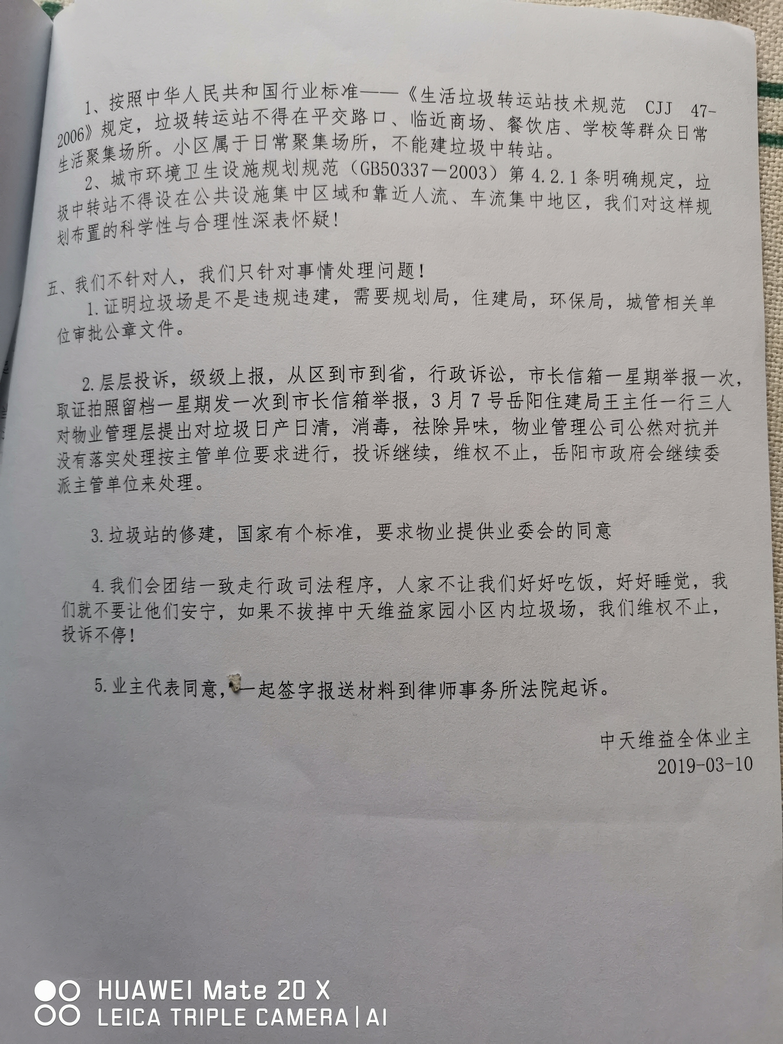 各级领导你们好! 关于白石岭中天维益垃圾场问题我们已经向市长信箱投诉举报四次了! 1.通过四次举报我们的核心只要一个,此垃圾场有没有规划局,住建局,环保局,城管局批复的法规正式公章准建文件?通过三次举报主管单位一直没有正面的回复我们和出示这些正规合法公章文件。 2.住建局提出的日产日清,消毒,祛异味,物业管理只在这段时间做到了日产日清,其他的消毒祛异味根本无法做到,我们直管部门没有从根本上以民生大方向解决问题根源。 3.我们作为小区业主的一员对在小区内建设垃圾场,深恶痛绝,我们集体102人签名要拔掉此垃圾场,对我们的日常生活影响太大了。 请主管单位正式公开出示此垃圾场的合法合规合理公章文件,以告知我们广大业主,我们不需要在这件事情上拉扯,因为受害的是我们,我们只希望你们站在民生环境上高效快速的处理问题 经开区管委会在3月21号也提出了提升公共卫生服务水平 共筑健康经开区,提升公共卫生服务质量、树立良好社会形象等方面,继续开创卫生健康工作新成就,要牢固树立以人民为中心的理念,切实增强卫生健康为民意识 希望各级领导帮我们切实的解决问题,不想正常维权路上漫漫长路不容易。 附件1:1553593423022816839262019472886.jpg 附件2:15535934550625509656417971369507.jpg 附件3:15535934813865931517506875862150.jpg |