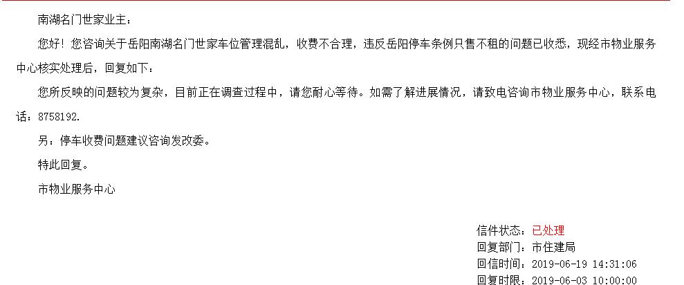 尊敬的市领导: 您好,我是岳阳南湖名门世家小区普通业主,我于3月前投诉,岳阳南湖名门世家违反最新颁布的《岳阳市机动车停车条例》只租不售规定,后发改委、物业公司等部门均有回复,可是各部门并没有解决问题,最后各部门回应均在处理,且小区业主委员会组织与开发商沟通车位出租问题,开发商推诿责任拖延时间,导致《岳阳市机动车停车条例》形同虚设。名门世家小区,在商业区,小区无地上车位,均为地下人防车位,可是开发商与各部门均在打圆场,无部门负责督促开发商落实管理条例。现政府制定了符合老百姓需要的政策与法律,可是在没有落实到普通老百姓身上,希望领导能督促开发商对小区业主合理价格开放出租车位,避免小区业主入住后与开发商矛盾激化,出现不理智维权。 谢谢 名门世家普通业主 |