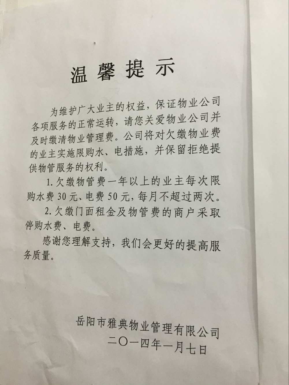 我是岳阳楼区雅典新城的业主,14年我家阳台漏水,多次与物业沟通均不作为,自行找人水管试压后均无问题,导致我们家墙面损坏严重,因此拒交14年物业费。我们家自2007年入住雅典新城以来,雅典物业公司(即雅典新城的房地产开发公司岳阳登峰房地产)从未组织广大业主召开业主委员会,却背着我们成立了业主委员会;非法占用业主的空间作为办公用地和私人住宅;擅自拆除更改小区内的建筑诸如篮球场等活动设施;违规招标电梯公司致使我们多用维修基金;提供日常服务质量差,物业费、水电费收费偏高等等,以上行为严重侵犯了业主的合法权益。 鉴于以上,有些业主以拒交物业费维权。2016年初,当我们再去物业公司购买水、电费时,物业公司工作人员以我们欠缴一年物业费为由,限制我们购水购电,只允许我们一次购买30元水电和50元电费,而且一月只准购买一次;对欠缴二年以上无业费的,不允许购买水电费。由于雅典新城的水电费只能到物业公司购买,这一规定严重影响了我们的基本生活权利,将直接导致我们今后无法居住。面对这样一个无视业主权利的“霸道物业公司”,我们广大业主恳求市长作主,还我们一个公道: 1,撤销限购水电费的无理规定; 2,成立新的业主委员会; 3,退还本该属于业主的活动空间; 4.更换物业公司 谢谢! |