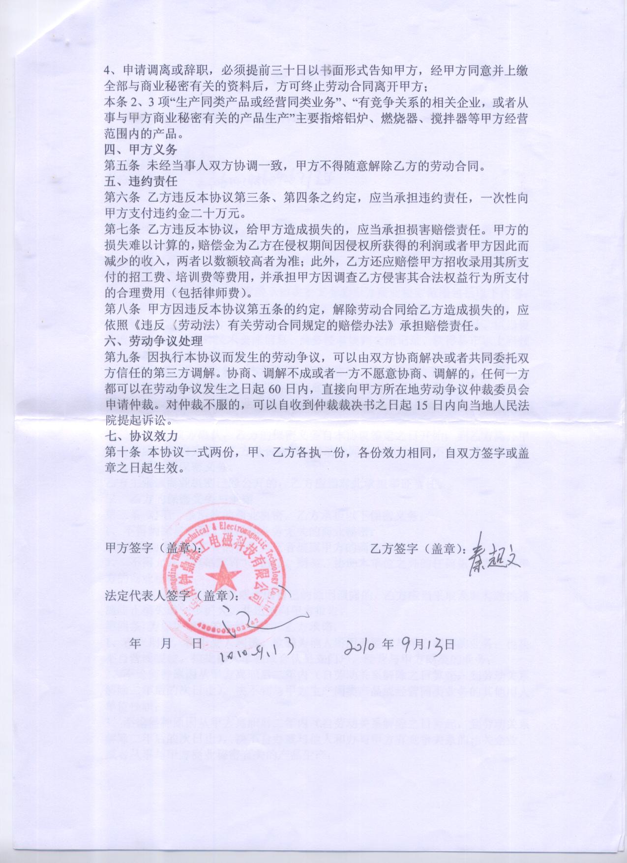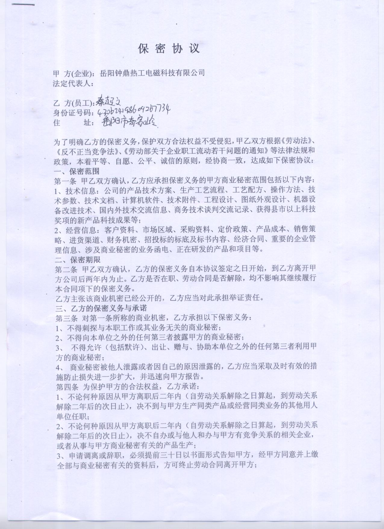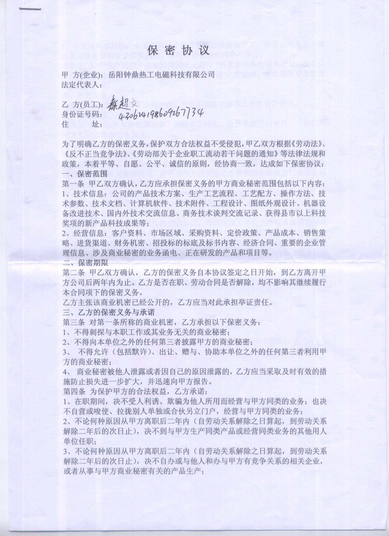 本人于2010年9月13日在岳阳钟鼎热工电磁科技有限公司签订了第一份保密协议,那是还在这家公司上班。